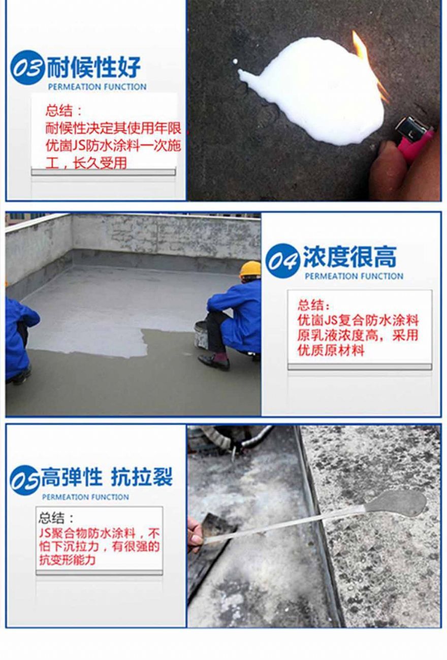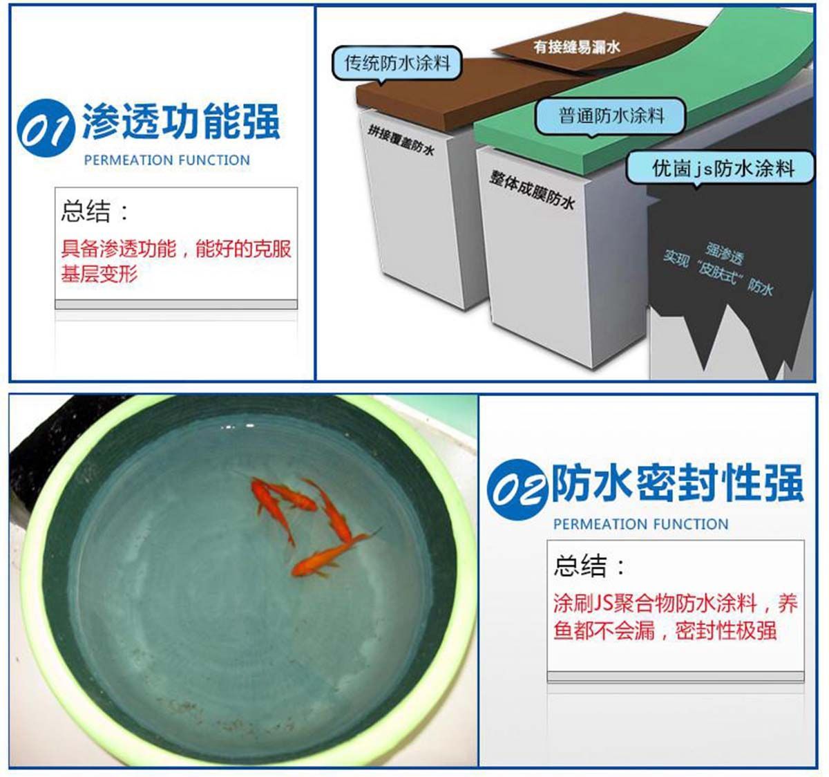 JS防水乳膠為綠色環保材料,它不污染環境、性能穩定、耐老化性優良、防水壽命長;使用安全、施工方便,操作簡單,可在無明水的潮濕基面直接施工;粘結力強,材料與水泥基面粘結強度可達0.5MPa 以上,對大多數材料具有較好的粘結性能;材料彈性好、延伸率可達200%,因此抗裂性、抗凍性和低溫柔性優良;施工性好,不起泡,成膜效果好、固化快;施工簡單,刷涂、滾涂、噴涂、刮抹施工均可。